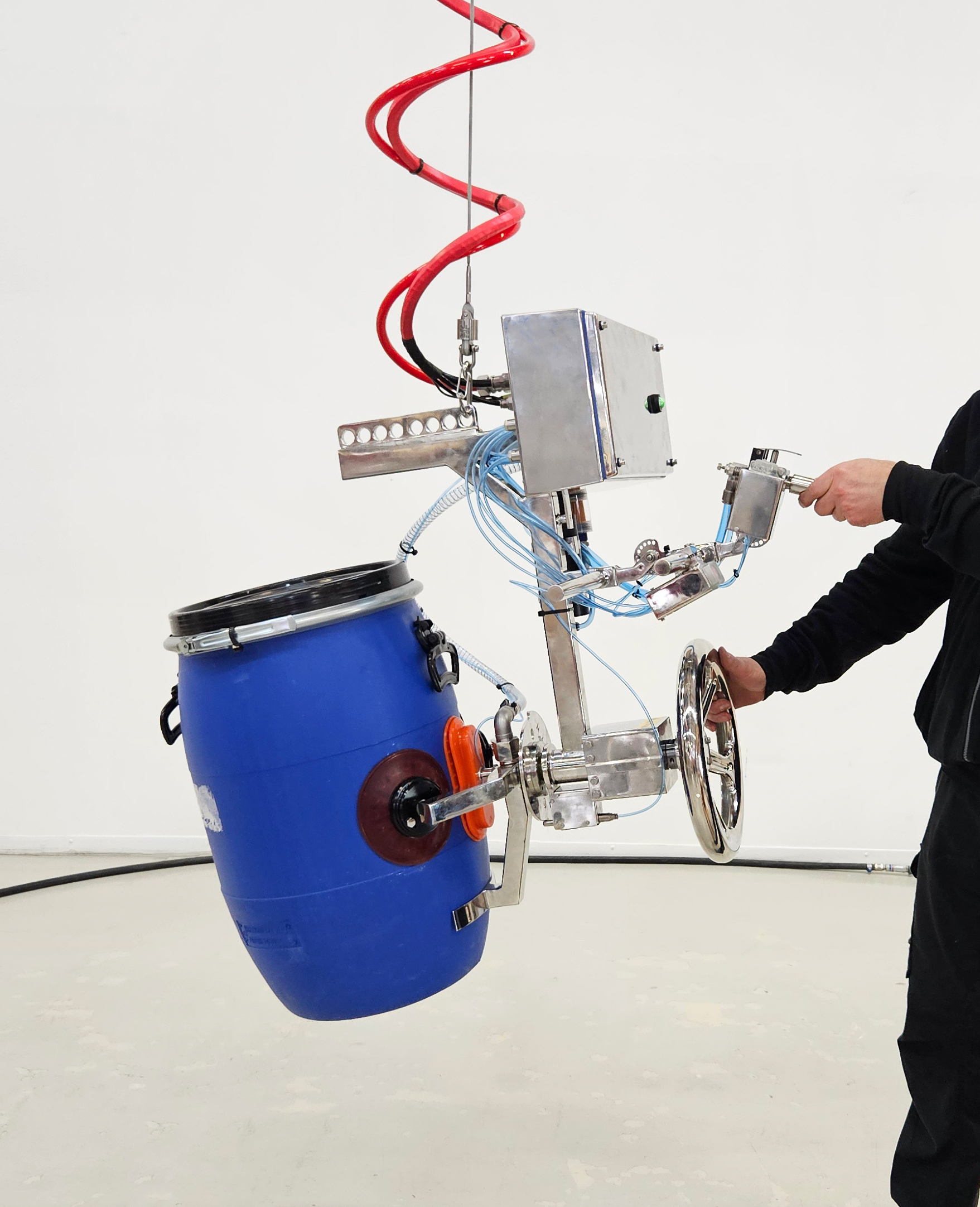 Grippers that latch on from the side or top – ideal for handling containers, jars, tubes, buckets, or porous sacks. (To ensure optimal hygiene, all control buttons and levers can be covered.)